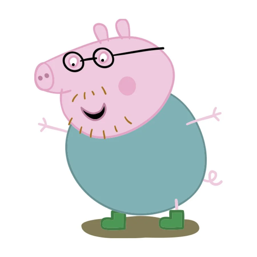 Daddy Pig is very good at diving, plays footballs for the local team and is a world-record muddy puddle jumping champion. He works as a structural engineer and a concrete technician and plays with Peppa and George in his spare time. He wears a turquoise shirt.