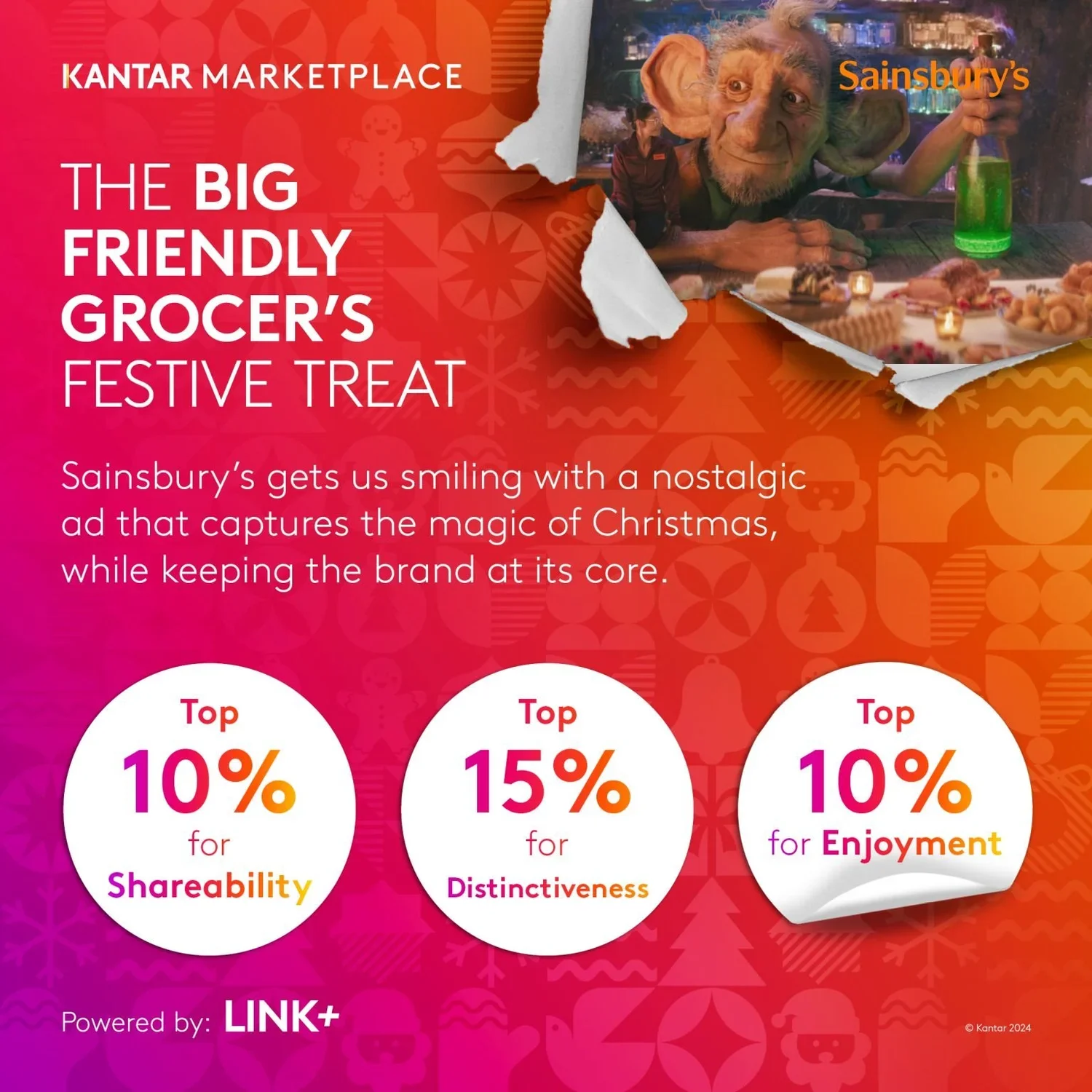 The creative didn’t just charm audiences; it delivered results. It became Sainsbury’s best-rated festive ad to date on System1’s Test Your Ad platform, scoring the maximum 5.9-stars across emotion, sales impact, and brand fluency. It was also crowned the official “winner of Christmas 2024” by Kantar, with the supermarket achieving 3.5% sales growth and its highest market share since 2019.